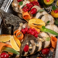 After cooling, remove the film from the roll and slice it like a sausage. Serve it on a plate. For a cold presentation, use garnishes such as lemon, lime, mixed greens, cherry tomatoes, and olives; for a hot presentation, brush the top of the roll with soy sauce or teriyaki sauce, briefly bake it, and then slice.