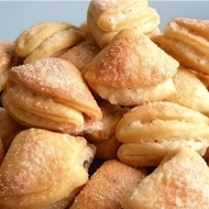 Each circle of dough is dipped in sugar on one side, then folded in half so that the sugar is inside. This half-circle is again dipped in sugar on one side and folded as before.