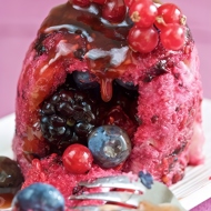 Before serving, invert the pudding onto a plate. Add the liqueur to the remaining syrup and drizzle it over the pudding.