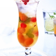 In a pitcher, mix the diced fruits, apricot nectar, champagne, and sparkling water.
