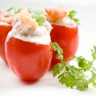 Prepare a mixture of fresh vegetables, finely chopped ham, and shrimp. Fill the tomatoes with this mixture. Place the remaining egg white halves on top.