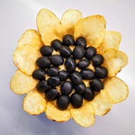 Spread the cheese over the eggs. Decorate the edges with chips shaped like petals.