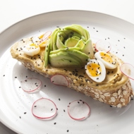 Spread guacamole on the toasts, peel and pit the second avocado, and slice it very thinly. Roll the slices into rose shapes and place them on the toasts. Garnish with quail eggs, thin slices of radish, and sesame seeds.
