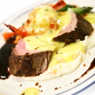 Plate the meat on serving dishes, top with the sliced lobster. Drizzle with the lemon mustard sauce and sprinkle with green onion.