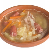 In the rendered fat from the bacon, fry the flour until brown. Slowly add the broth to achieve a medium-thick sauce. Season well and pour over the vegetables. Cook in a covered pot until done. Before serving, add the fried sausages to the stew.