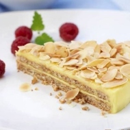 Spread half of the cream on one cake layer, place the second layer on top, and cover the top and sides with the remaining cream. Sprinkle the cake (top and sides) with almond flakes and refrigerate for at least 6 hours (preferably overnight).