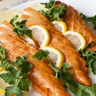 Remove the cooked breasts from the oven and let them cool. Slice and serve with lemon wedges.