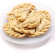 Roll the dough out very thin, use a metal cutter or a glass to cut out circles, brush them with beaten egg white, place a teaspoon of cottage cheese filling on each circle, then fold the edges together and pinch to seal.