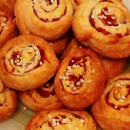 Cut the log into small slices about 1 cm thick. Place the small rolls on a baking sheet lined with parchment paper, and sprinkle the rolls with sesame seeds again.