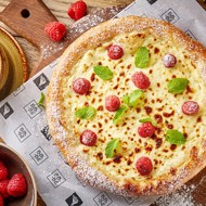 Place raspberries on the finished khachapuri, dust with powdered sugar through a sieve, and garnish with mint.