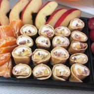 Place a strip of the cottage cheese mixture about 1/3 from the edge of the pancake. Next to it, place the fruits and roll the pancake tightly into a roll. Do the same with the remaining pancakes and filling, then refrigerate them for 1 hour.