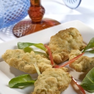 Heat 3 tablespoons of olive oil in a skillet over medium heat. Drop 1 tablespoon of the batter for each pancake onto the skillet and fry for 3 minutes on each side until golden brown. Transfer to the baking sheet and place in the oven to keep warm. Serve with lemon wedges.