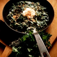 Add the leaves, increase to medium heat, and cook for another 4 minutes until tender. Season with salt and pepper, plate, sprinkle with pine nuts, and serve at room temperature.