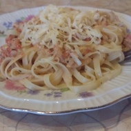 Mix the tagliatelle with half of the sauce. Serve on plates and drizzle with the remaining sauce. Sprinkle with grated Parmesan on top.