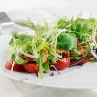 On the plates, spread the sauce, then add the tomatoes with avocado and onion, followed by the sliced chicken fillet, and finish with a salad mix (arugula, radicchio, corn, frisée).
