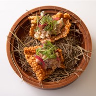 Serve on the tapioca chip and fish skin.