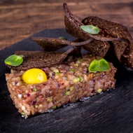 Remove the seeds from the cucumber and dice it into small cubes, then dice the herring fillet and red onion into the same size cubes. Dress with truffle oil and mix well. Add salt and pepper to taste.