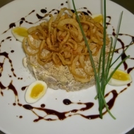 Place the resulting mixture into portion molds (ring, etc.), and arrange in the center of each serving plate.