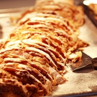 Chop the apricots. Place the filling and roll up the strudel. Tuck in the edges, place it on a baking sheet lined with parchment paper. Brush with butter and bake for 40 minutes at 347°F.