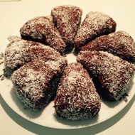 Let the baked sponge cool, then cut it into squares of any size — I have both large and small. You can use a glass to cut out circles or make triangles... whatever you prefer. Take each square, dip it in the chocolate syrup for a couple of seconds, then remove it and roll it in shredded coconut. The longer you hold the sponge in the chocolate, the more chocolate it will absorb. I didn't hold it long, about 15 seconds, no longer. But if you hold it longer, it will become a chocolate pastry.