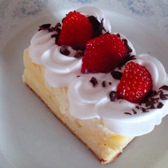 Cool the baked pie, cut into portions, decorate with cream, and garnish with fruits.