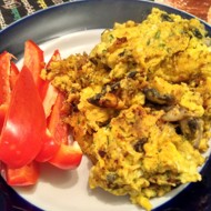 Tender omelette with mushrooms, spices, and cheese.
