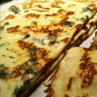 Pour the batter over the mushrooms. Watch for the batter to start bubbling slightly, place thin slices of cheese on one half of the pancake, fold the pancake in half, and then again — it should form a roll.