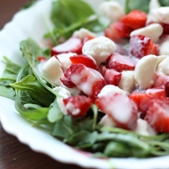 Place torn spinach and arugula in a bowl, then top with sliced strawberries and mini mozzarella.