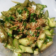 Mix the cucumbers with the sauce, add cilantro, and sprinkle sesame seeds on top.