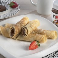 Roll the finished pancakes into tubes, cut each one in half for easy handling. Serve with Nutella®.
