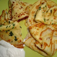 Fry thin pancakes of medium diameter in a hot skillet with a small amount of vegetable oil (not filling the entire skillet, as it will be difficult to flip).
