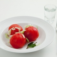 Make a small cross-cut on the bottom of the tomatoes, blanch them in boiling water, and then peel off the skin.