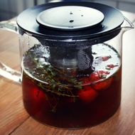 We add thyme not to the brew, but to the space for water in the teapot. You can add oregano if you have it. Berries work well here too, even frozen ones. For example, we use strawberries.