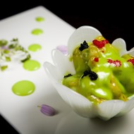 Place the shrimp on a plate, drizzle with wasabi sauce, and garnish with black and red tobiko caviar.