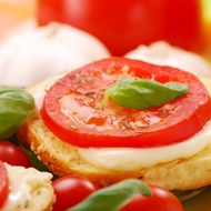 Preheat the grill to maximum. Slice the fresh tomatoes and distribute them on four plates. Allow the oil to drain, cut the canned tomatoes into strips and place them on top of the fresh ones.