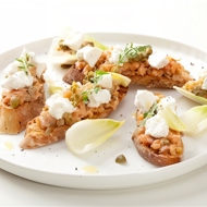 Place the tartare on the toasts, top with pieces of ricotta, and serve with chicory and arugula leaves, drizzled with lemon juice.