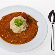 At the end of stewing, add the green pepper, tomatoes, and bring to a boil. Then season the dish with sour cream mixed with sautéed flour, and bring to a boil once more. Serve with flour dumplings.