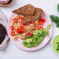 Place the scrambled eggs, avocado, and tomatoes on a plate.
