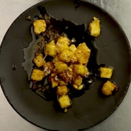 Cut the tofu into cubes, coat them in cornstarch, then dip in egg. Fry in hot oil. Next, combine the fried tofu with the sauce and strained shrimp oil. When serving, sprinkle with dried shrimp.