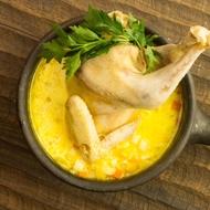 Gather a bouquet garni made of charred parsnip, hot pepper, bay leaf, allspice, star anise, and cloves. Place the chicken with the spice pouch in water and simmer to make the broth. It should reduce to half its volume.