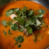 Add the tom yum paste to the soup and stir well. The tom yum paste is acidic. If you add it to the broth and then pour in milk, it will curdle. Therefore, it should only be added afterwards.