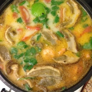 Bring the prepared broth (300 g) to a boil, add shrimp and squid (cook for 2–3 minutes).