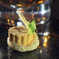 A cool sour-cream mousse, contrasting beautifully with fragrant, fiery whiskey. To prevent the puff pastry from rising too much and bubbling, it should be lined with parchment paper, with an empty pot placed on top as a lid—and then baked.