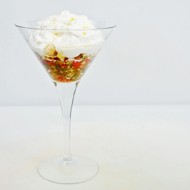 Finally, fill the glasses with a light cream made from mozzarella and cream using a siphon. For added aroma, drizzle a small amount of olive oil — about a quarter teaspoon per serving. Serve immediately.