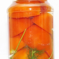 At the bottom of a washed and sterilized jar, place 1 bay leaf, 5 parsley sprigs, and 3 cloves of garlic. Cut the tomatoes in half and place them cut side down.