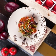 Slice the tomatoes into wedges, julienne the onion, and mix them in a bowl with pesto. Season with salt and pepper.