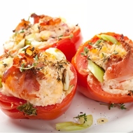Stuff the tomato halves with the prepared filling, sprinkle with the remaining breadcrumbs and thyme leaves, drizzle with oil, and place in a preheated oven at 374°F for 25–30 minutes.