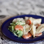 Cook the tortellini in salted water. When serving, drizzle with sauce and garnish with rounds of boiled carrot.