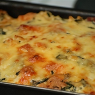 Place in a preheated oven at 392°F for about 15–20 minutes, so the top layer is browned but not burnt. After baking, remove and let it cool, but this is not necessary.