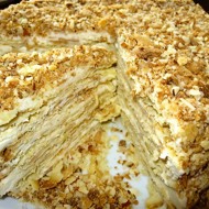 With 9 layers, each will be about 30 cm in diameter. Therefore, if you want to make a smaller cake, divide the dough into more parts; this way, the cake will grow in height rather than width. When you divide the dough, keep the parts in the refrigerator and take out one portion at a time to roll out. Since the dough contains a lot of butter, it will become too soft at room temperature, making it difficult to roll out the layers. Allow the finished cream to cool slightly before spreading it between the layers.